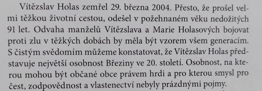 - Pan Vítězslav Holas byl velmi významným občanem naší obce a dlouholetým členem i starostou březinské TJ.(tehdy Sokola). Podrobněji se o jeho životě můžete dočíst v knize vydané k 800.výročí založení obce Březina.
